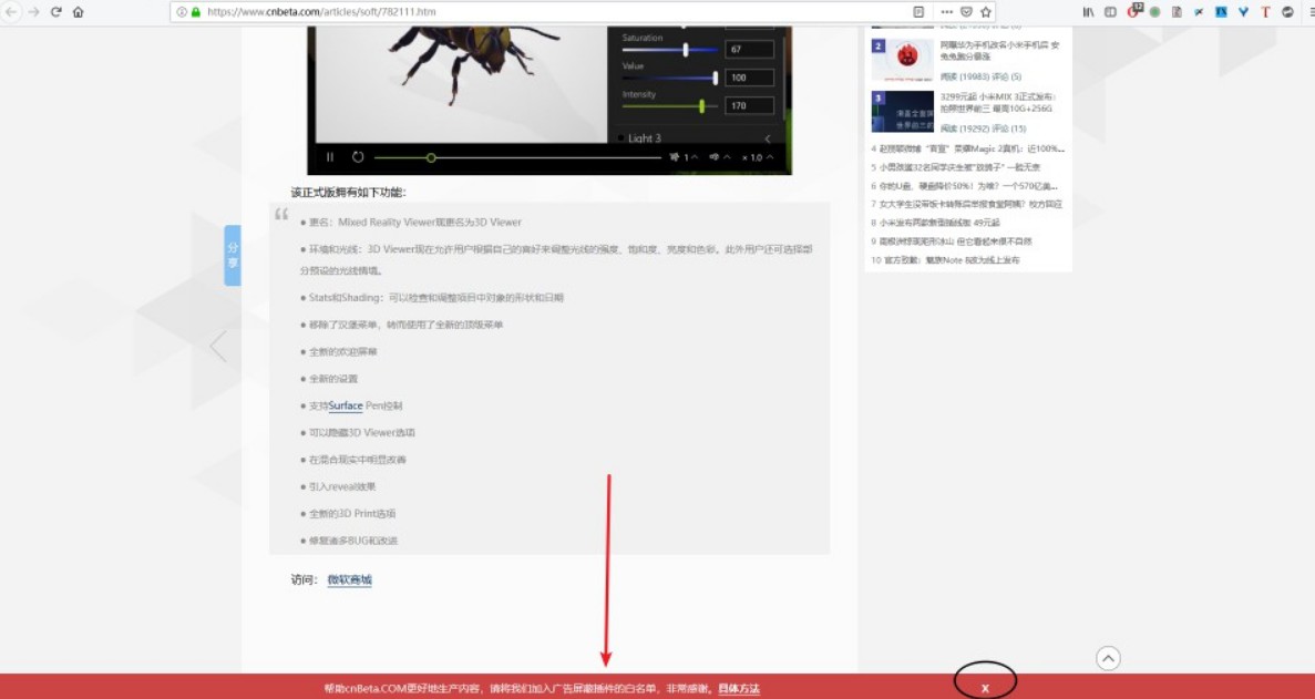然而cnBeta有没有考虑过,其实热衷看资讯站的朋友,大部分都具备一部分的计算机水平...就像笔者一样,用Chrome浏览器,装Adblock广告屏蔽插件,屏蔽了cnBeta网大部分的广告。cnBeta为了不让用户屏蔽,又在每篇资讯页底部加入了红色工具栏,提示用户不要使用Adblock过滤,如下: