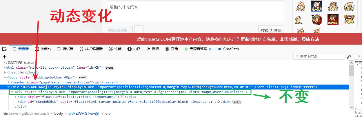 然鹅,每次都要看到这个红色工具条,都要强迫症似的去点击关闭,于是,拥有计算机知识的我,不得不进行一番屏蔽,经分析发现,Adblock之所以过滤不了,是因为cnBeta底部红色工具条的div元素id属性是动态的!所以,只能自己来加规则了,反正,目前经分析,CSS样式暂时没有变化,那我们就针对CSS元素过滤了,以后有变化再进行更新: