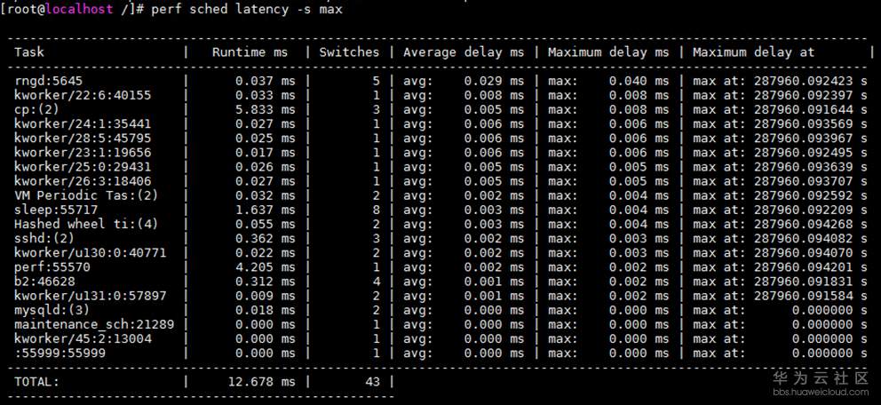 perf sched latency命令可以解析当前目录下的perf.data文件。“-s”表示进行排序,后接参数“max”表示按照最大延迟时间大小排序。